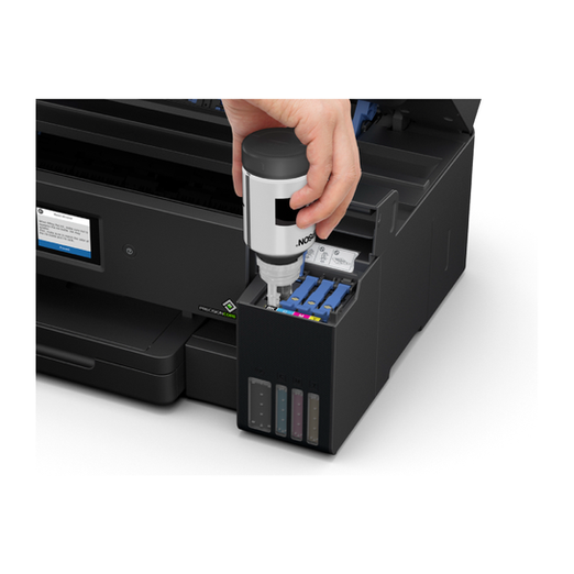 Ahorra hasta 90% en tinta con las botellas de reemplazo de bajo costo de esta impresora inalámbrica multifuncional 4 en 1 con impresión 100% sin cartuchos. Los juegos de botellas de tinta original Epson que equivalen a unos 35 juegos de cartuchos de tinta